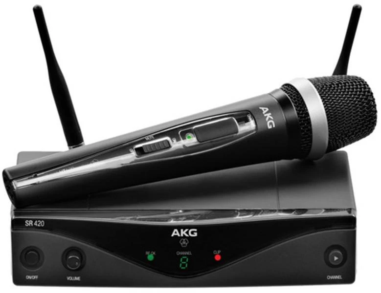 Élő elő elő előadásokhoz, prezentációkhoz, installációkhoz A WMS420 vezeték nélküli mikrofon rendszer rendkívül rugalmas és könnyen használható megoldás. Az ultra magas frekvenciájú rendszer, másodperceken belül egyaránt alkalmas a színpadon , valamint olyan helyeken, ahol egy-vagy többcsatornás megoldásra van szükség. A WMS420 egy sokoldalú, és minőségi egycsatornás vezetéknélküli rendszer melyet kifejezetten kisebb alkalmazásokhoz fejleszettek ki, mint pl. iskolai és városi rendezvények, templomi alkalmazások, művelődési központok stb. A WMS420 új teljesítménybeli és minőségi határokat állít fel az egycsatornás rendszerek piacán. A WMS420 vocal vezeték nélküli szett rendszer tartalma SR420 vevő, HT420 kézi adó. A HT420 kézi adó kapható szabadalmaztatott D5 dinamikus mikrofonfejjel. Ez a kapszula felel a maximális hangnyomásért, reducálja a kéz zajt és garantálja a híres AKG hangzás. A HT420 kézi adók integrált töltőérintkezőkkel rendelkeznek, csakúgy mint a WMS470-es széria, így kompatibilisek a CU400 töltőállomással. Továbbá az adók kivételes nyolc óra működésre képesek egyetlen AA méretű elemel, ami jelentősen csökkenti a működési költségeket a minden napi használat mellett. A levehető vevő antennák lehetővé teszik a használatát professzionális kiegészítőkkel, mint például antenna elosztók és a távoli szerelt irányított antennák többcsatornás rendszerekhez. 1 Kéziadó HT420 1 Álló vevő SR420 2. Vevő antenna 1. AC adapter 1 állvány adapter 1 AA méretű elem