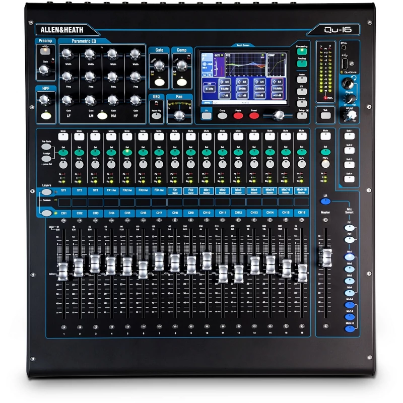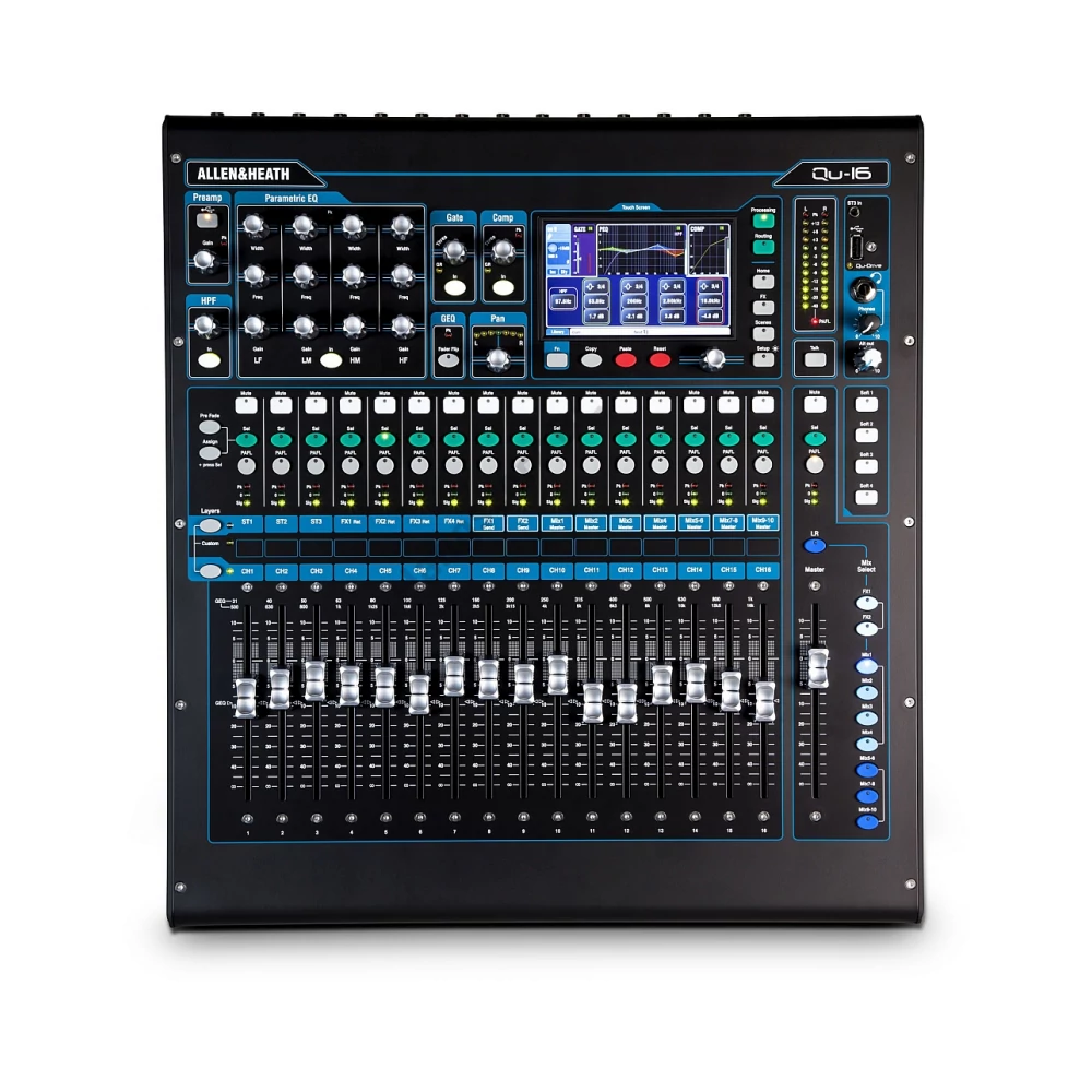 16 csatornás, 16 buszos digitális keverő. 19" méretű rackesíthető keverő 16 mono bemenet XLR/TRS 3 sztereó bemenet 4 sztereó effekt visszatérő 16 busz 12 mix kimenet L/R, 4 mono aux, 3 szetereó aux AES digitális kimenet 4 némító csoport 4 DCA csoport Trim, polaritásfordítás, HPF, kapu, inzert, 4-sávos parametrikus EQ, compressor, késleltetés minden bemeneti csatornán Inzert, 1/3 oktávos grafikus EQ, compressor, késleltetés a Main LR és Mono Mix kimeneti csatornákon Inzert, 4-sávos parametrikus EQ, compressor, késleltetés a sztereó kimeneti csatornán Beépített zajgenerátor Real Time analyzer Motorizált féderek Menthető/előhívható AnaLOGIQ előfokok Qu-Drive soksávos felvételi/lejátszási lehetőség USB adattároló segítségével 800x400 felbontású érintőképernyő iLive effektkönyvtár dSNAKE Remote Audio Port: csatlakozási lehetőség dSnake stage boxhoz Kompatibilis az ME Personal Mixing Systemmel Távvezérlési lehetőség a Qu-Pad iPad applikáció segítségével Qu-You iPhone/Android personal monitoring applikácíó