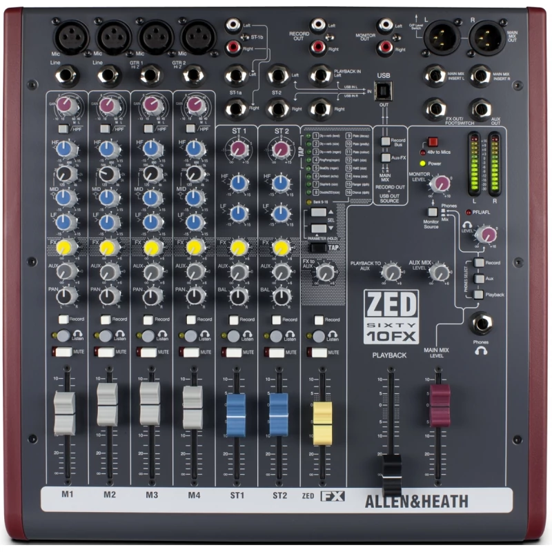 Allen&Heath ZED60-10FX, keverő 60mm-es fader-ekkel, 4 monó/2 sztereó csatorna, 1 AUX, USB, effekt