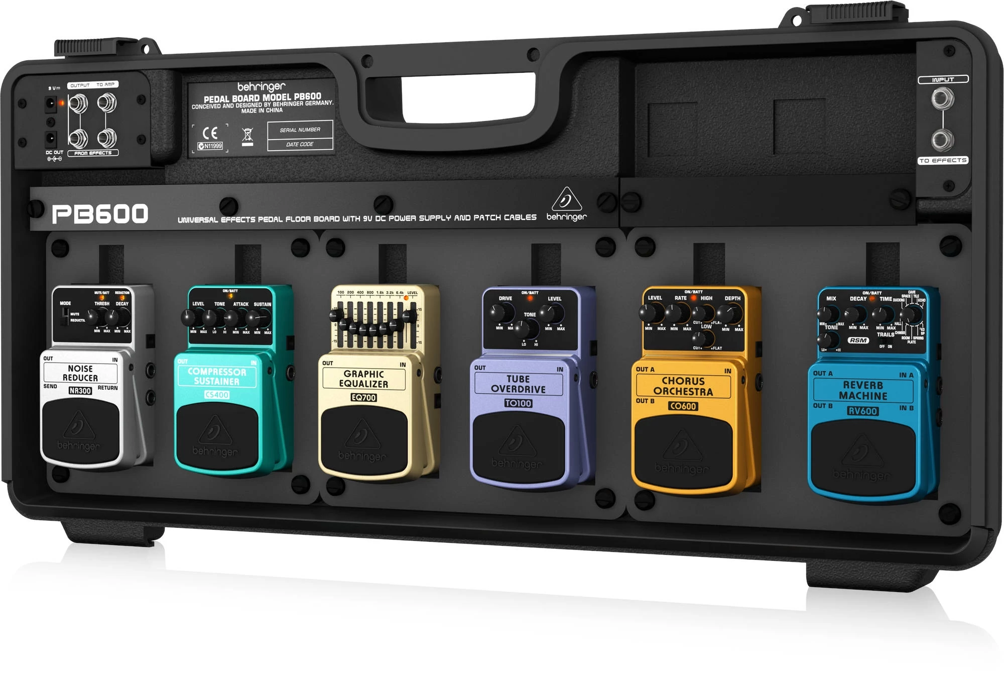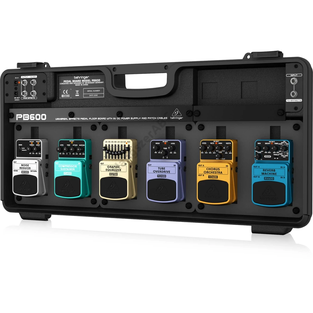 6db 2.5" x 4.5"-ös szabvány méretű gitárpedál összekötésére alkalmas. Ha pedig a pedáljaid ennél nagyobb méretűek, akkor a tartószivacsot egyszerűen ki tudod vágni a megfelelő formára. A Behringer PB600-as tartalmazza a szükséges 6.3mm-es jack kábeleket is, így összekötve tárolhatod és szállíthatod a pedáljaidat, azonnal készen állnak arra, hogy rákösd a gitárt. A 6-csatlakozós daisy chain tápkábel szintén tartozék, így a tápellátásuk is megoldott, a beépített tápegység segítségével.
