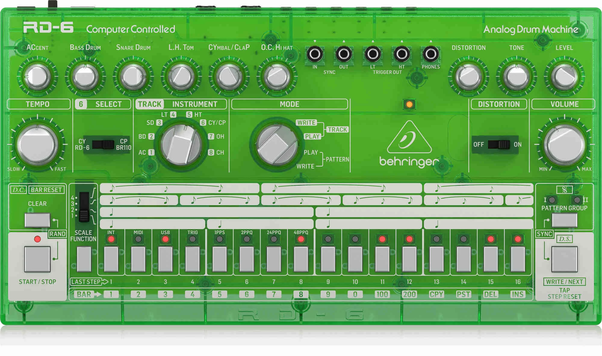 Klasszikus analóg dobgép 8 dobhanggal, 16 lépéses szekvenszerrel és torzító effektussal