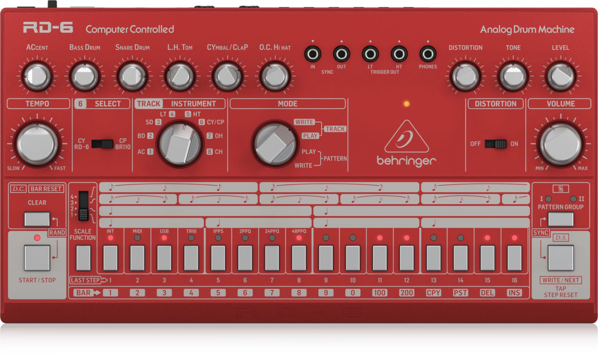 Klasszikus analóg dobgép 8 dobhanggal, 16 lépéses szekvenszerrel és torzító hatással