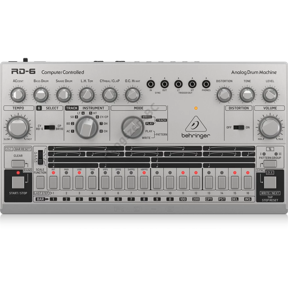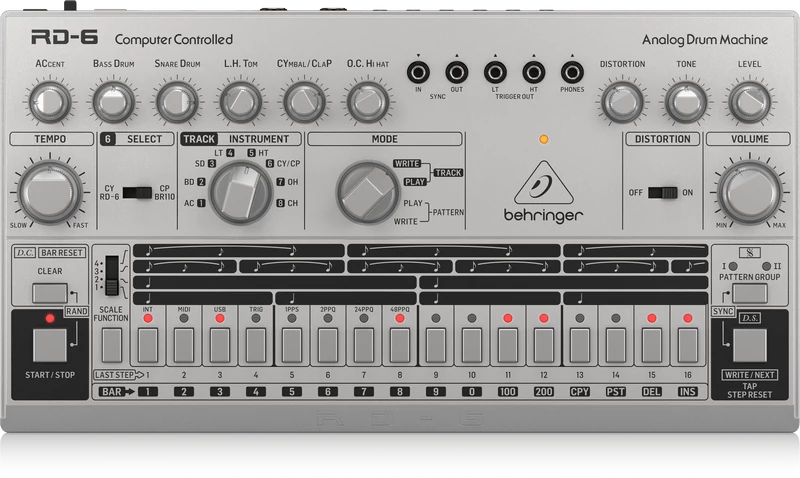 Klasszikus analóg dobgép 8 dobhanggal, 16 lépéses szekvenszerrel és torzító effekttel