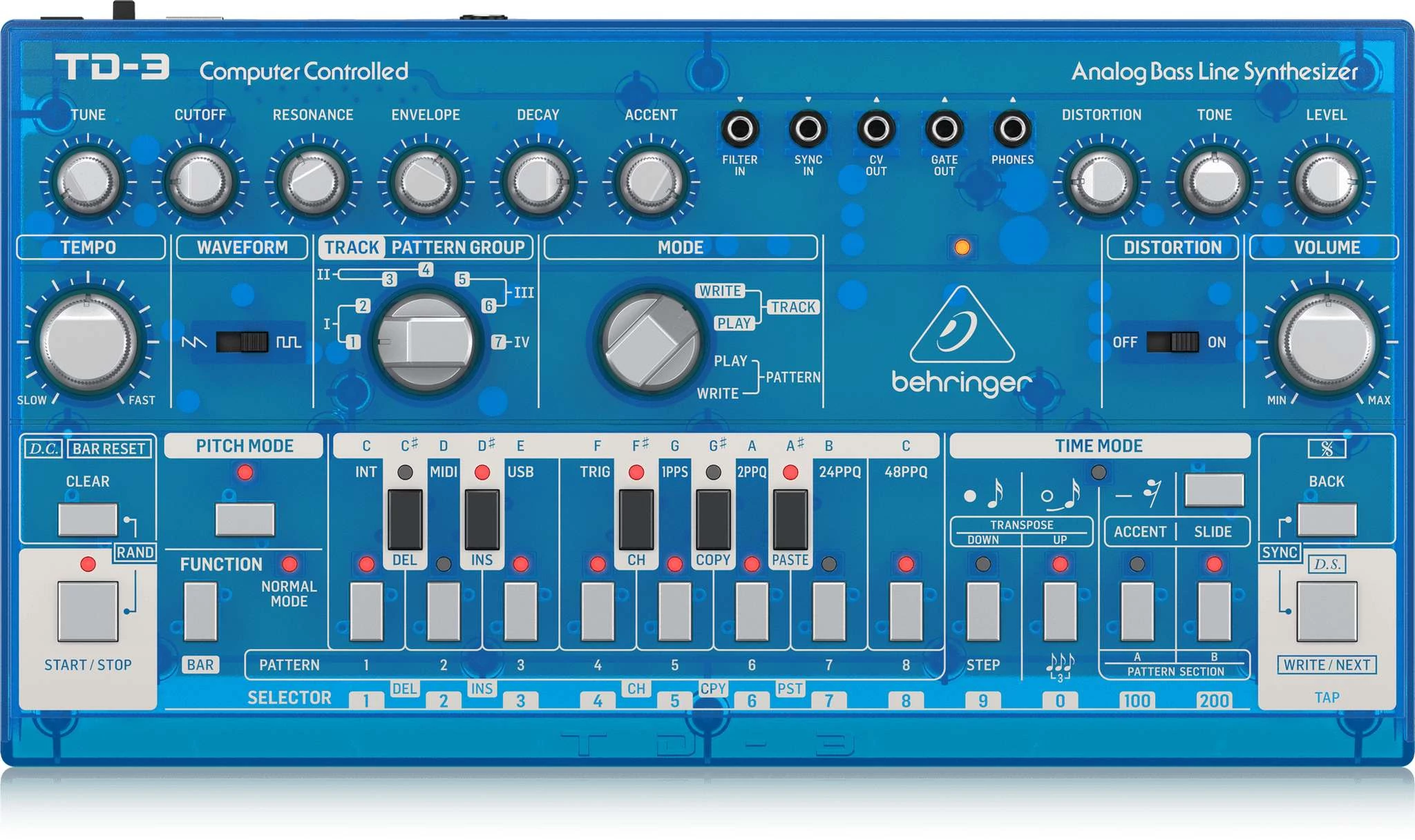 Analóg basszus szintetizátor, VCO, VCF, 16 lépéses szekvenszer, torzító effektek és 16 hangos polilánc
