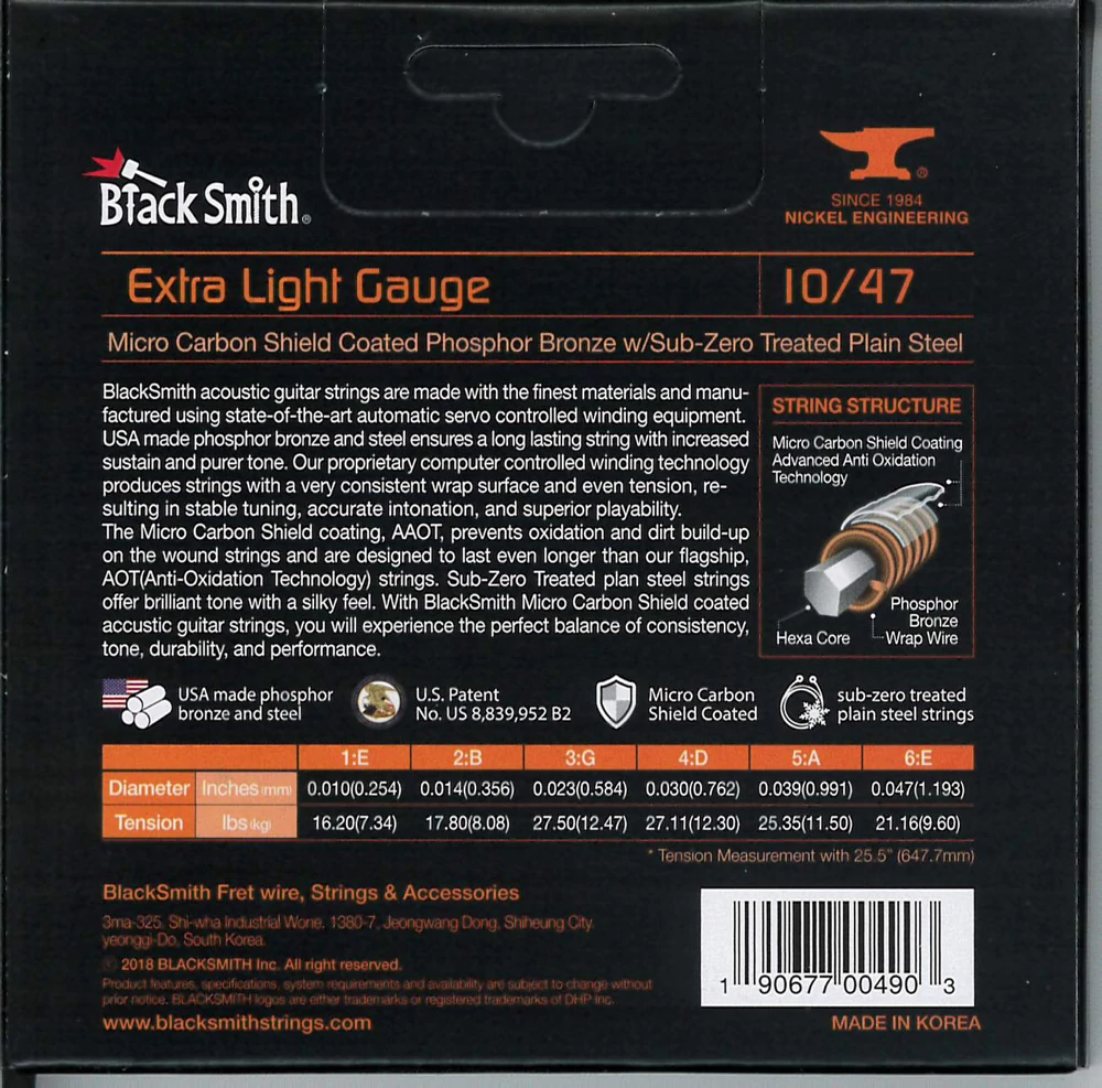 A BlackSmith akusztikus gitár húrok a legkiválóbb alapanyagokból készülnek a legmodernebb tekercselő berendezés használatával. Az USA-ban gyártott foszfor-bronz és acél hosszú élettartamot és megnövelt hangkitartást biztosít. Számítógépvezérelt technológiával egyenletes tekercselést és húrnyomást kapunk, ami stabil hangolást, pontos intonációt és kiváló játszhatóságot eredményez.