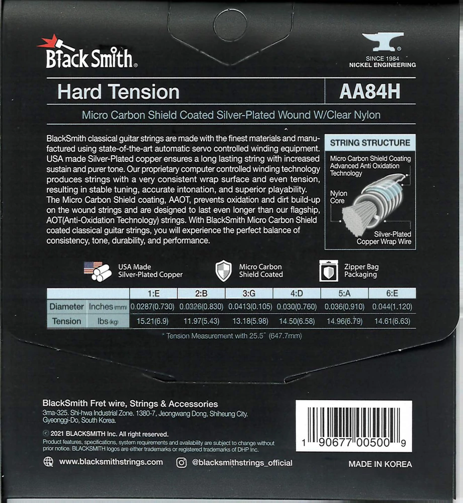 A BlackSmith klasszikus húrok a legkiválóbb alapanyagokból készülnek a legmodernebb tekercselő berendezés használatával. Az USA-ban gyártott ezüst bevonatos réz és tiszta nylon hosszú élettartamot és megnövelt hangkitartást biztosít. Számítógépvezérelt technológiával egyenletes tekercselést és húrnyomást kapunk, ami stabil hangolást, pontos intonációt és kiváló játszhatóságot eredményez.