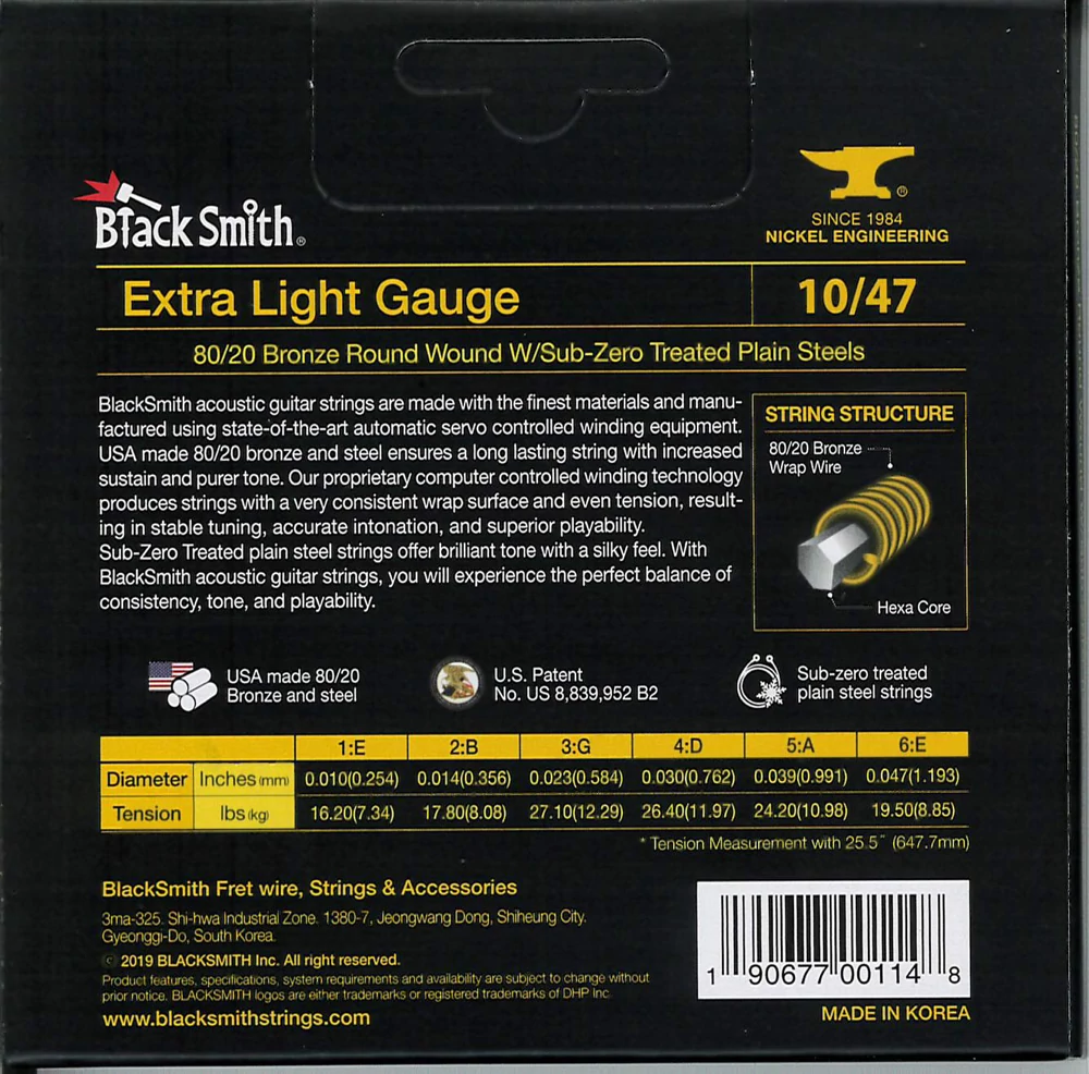 A BlackSmith akusztikus gitár húrok a legkiválóbb alapanyagokból készülnek a legmodernebb tekercselő berendezés használatával. Az USA-ban gyártott 80/20 bronz és acél hosszú élettartamot és megnövelt hangkitartást biztosít. Számítógépvezérelt technológiával egyenletes tekercselést és húrnyomást kapunk, ami stabil hangolást, pontos intonációt és kiváló játszhatóságot eredményez. A fagyasztással kezelt acél húrok csilingelő hangzást és lágy tapintást adnak. Ez együttesen biztosítja a konzisztencia, a hangszín, a tartósság és a teljesítmény tökéletes egyensúlyát. Az egyedülálló, szabadalmazott vákuumzárású, csavarodásmentes csomagolásnak köszönhetően a húr nem rozsdásodik és nem sérül.