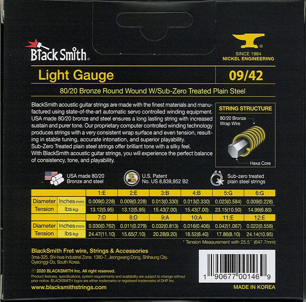 A BlackSmith akusztikus gitár húrok a legkiválóbb alapanyagokból készülnek a legmodernebb tekercselő berendezés használatával. Az USA-ban gyártott 80/20 bronz és acél hosszú élettartamot és megnövelt hangkitartást biztosít. Számítógépvezérelt technológiával egyenletes tekercselést és húrnyomást kapunk, ami stabil hangolást, pontos intonációt és kiváló játszhatóságot eredményez. A fagyasztással kezelt acél húrok csilingelő hangzást és lágy tapintást adnak. Ez együttesen biztosítja a konzisztencia, a hangszín, a tartósság és a teljesítmény tökéletes egyensúlyát.