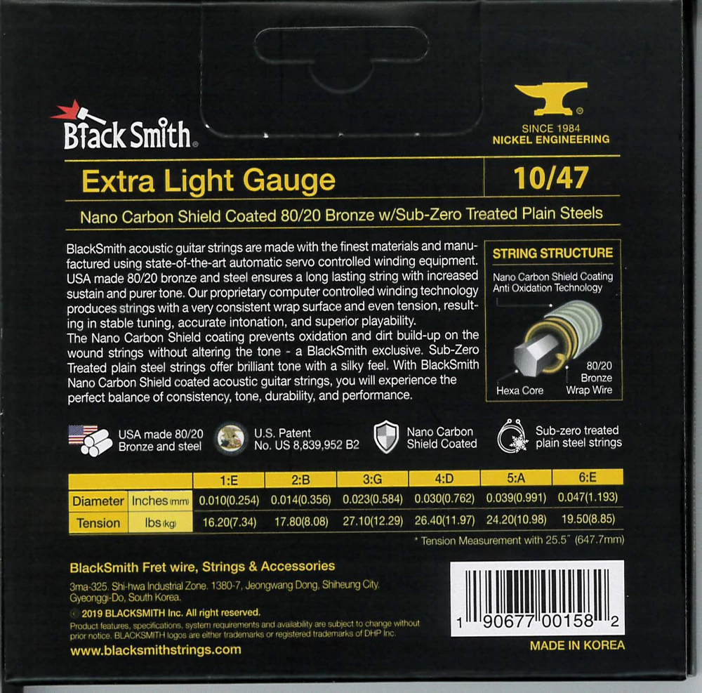 BlackSmith-exkluzív Nano Carbon Shield bevonattal rendelkezik, amely megakadályozza az oxidációt és a szennyeződések felhalmozódását anélkül, hogy a hangzást megváltoztatná. A fagyasztással kezelt acél húrok csilingelő hangzást és lágy tapintást adnak. Ez együttesen biztosítja a konzisztencia, a hangszín, a tartósság és a teljesítmény tökéletes egyensúlyát.