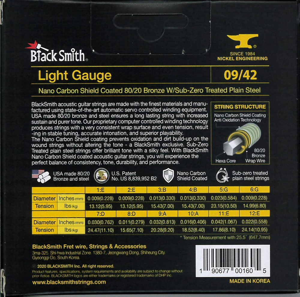 BlackSmith-exkluzív Nano Carbon Shield bevonattal rendelkezik, amely megakadályozza az oxidációt és a szennyeződések felhalmozódását anélkül, hogy a hangzást megváltoztatná. A fagyasztással kezelt acél húrok csilingelő hangzást és lágy tapintást adnak. Ez együttesen biztosítja a konzisztencia, a hangszín, a tartósság és a teljesítmény tökéletes egyensúlyát.