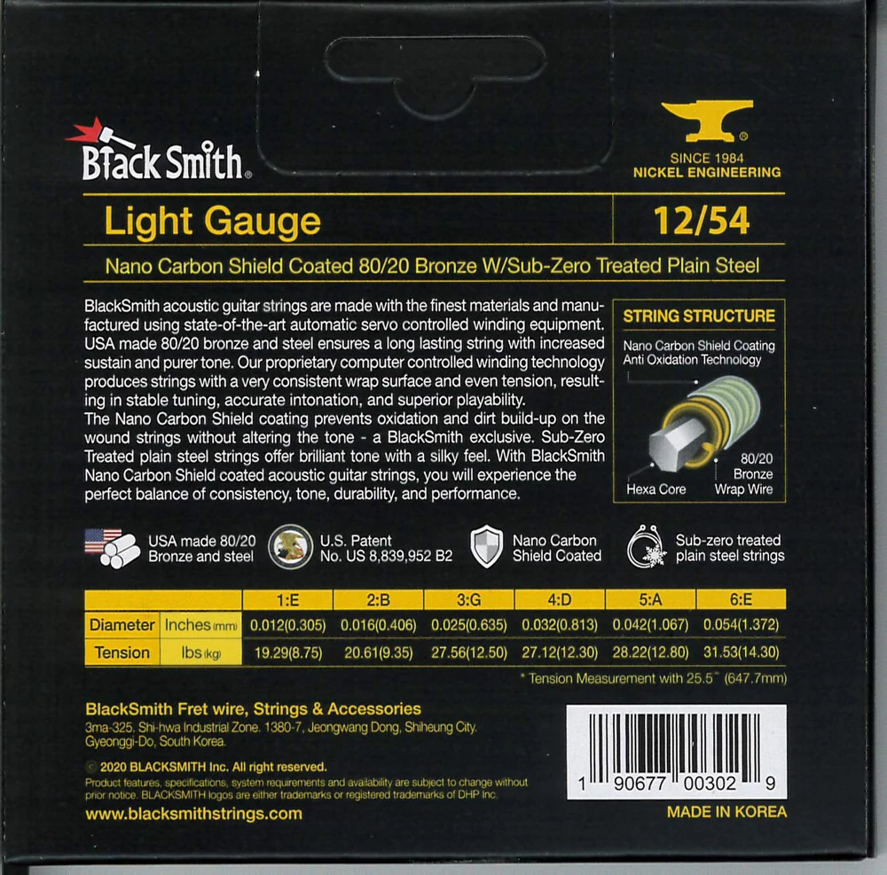 BlackSmith-exkluzív Nano Carbon Shield bevonattal rendelkezik, amely megakadályozza az oxidációt és a szennyeződések felhalmozódását anélkül, hogy a hangzást megváltoztatná. A fagyasztással kezelt acél húrok csilingelő hangzást és lágy tapintást adnak. Ez együttesen biztosítja a konzisztencia, a hangszín, a tartósság és a teljesítmény tökéletes egyensúlyát.