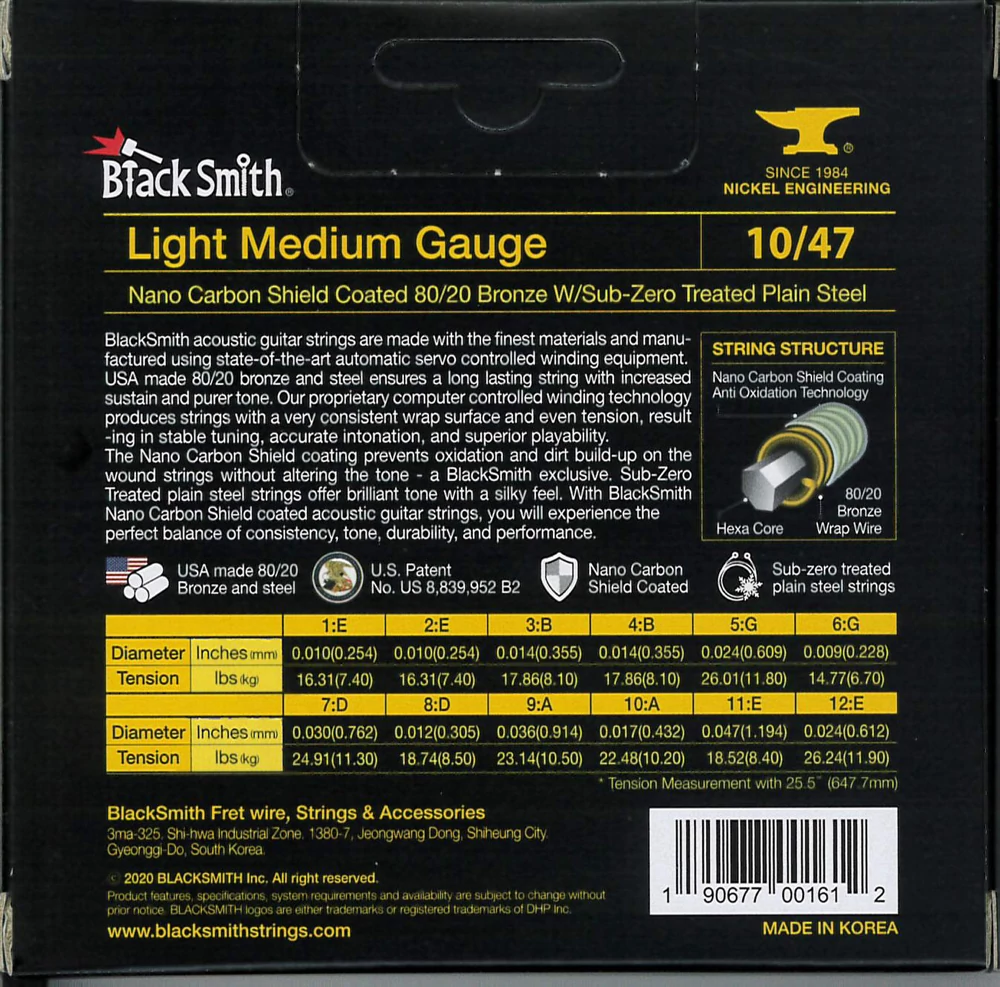 BlackSmith-exkluzív Nano Carbon Shield bevonattal rendelkezik, amely megakadályozza az oxidációt és a szennyeződések felhalmozódását anélkül, hogy a hangzást megváltoztatná. A fagyasztással kezelt acél húrok csilingelő hangzást és lágy tapintást adnak. Ez együttesen biztosítja a konzisztencia, a hangszín, a tartósság és a teljesítmény tökéletes egyensúlyát.