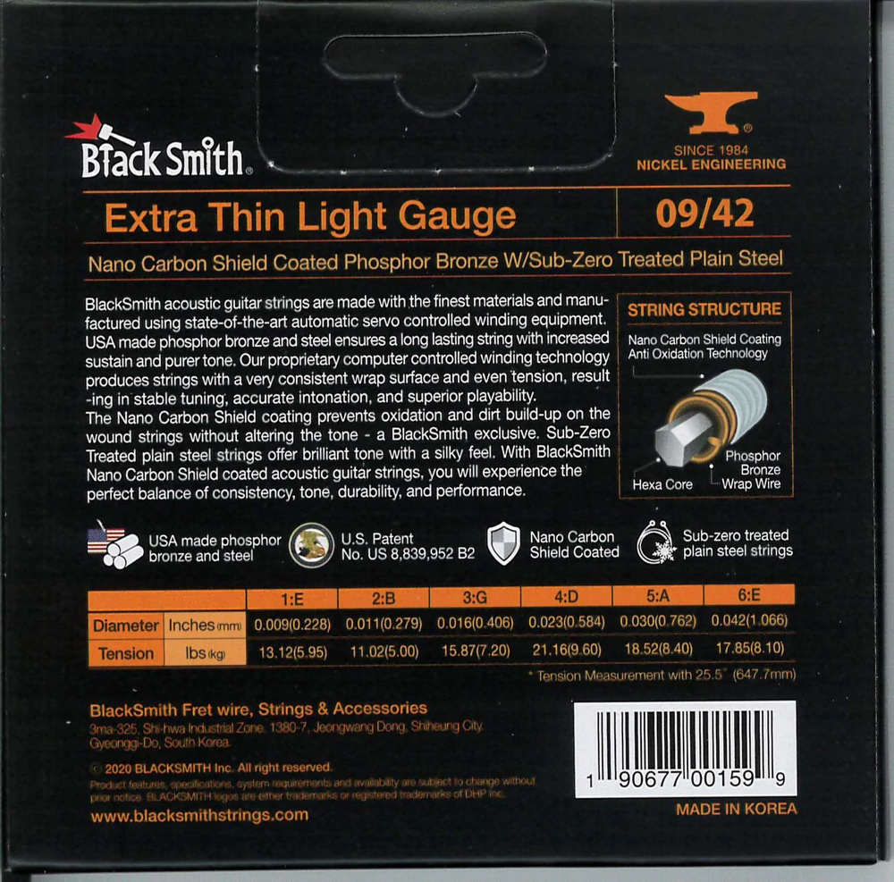 BlackSmith-exkluzív Nano Carbon Shield bevonattal rendelkezik, amely megakadályozza az oxidációt és a szennyeződések felhalmozódását anélkül, hogy a hangzást megváltoztatná. A fagyasztással kezelt acél húrok csilingelő hangzást és lágy tapintást adnak. Ez együttesen biztosítja a konzisztencia, a hangszín, a tartósság és a teljesítmény tökéletes egyensúlyát.
