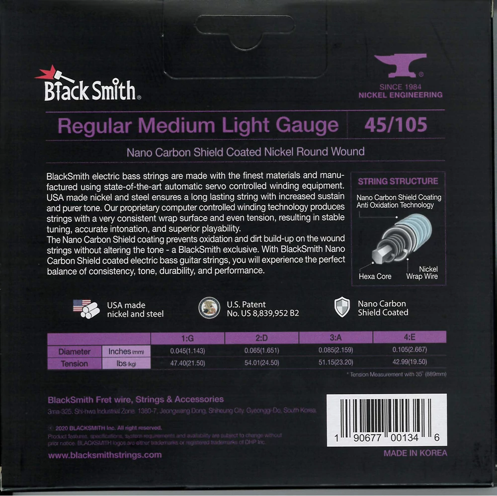 A BlackSmith elektromos basszus húrok a legkiválóbb alapanyagokból készülnek a legmodernebb tekercselő berendezés használatával. Az USA-ban gyártott nikkel és acél hosszú élettartamot és megnövelt hangkitartást biztosít. Számítógépvezérelt technológiával egyenletes tekercselést és húrnyomást kapunk, ami stabil hangolást, pontos intonációt és kiváló játszhatóságot eredményez.