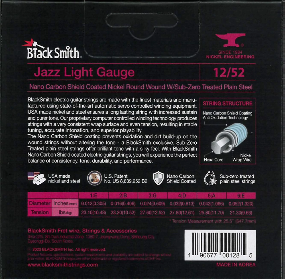 BlackSmith-exkluzív Nano Carbon Shield bevonattal rendelkezik, amely megakadályozza az oxidációt és a szennyeződések felhalmozódását anélkül, hogy a hangzást megváltoztatná. A fagyasztással kezelt acél húrok csilingelő hangzást és lágy tapintást adnak. Ez együttesen biztosítja a konzisztencia, a hangszín, a tartósság és a teljesítmény tökéletes egyensúlyát.