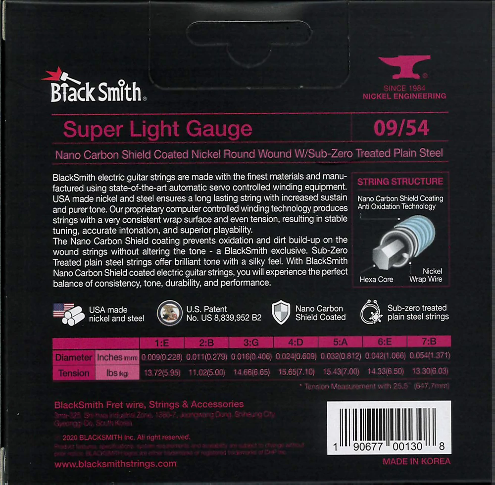 BlackSmith-exkluzív Nano Carbon Shield bevonattal rendelkezik, amely megakadályozza az oxidációt és a szennyeződések felhalmozódását anélkül, hogy a hangzást megváltoztatná. A fagyasztással kezelt acél húrok csilingelő hangzást és lágy tapintást adnak. Ez együttesen biztosítja a konzisztencia, a hangszín, a tartósság és a teljesítmény tökéletes egyensúlyát.