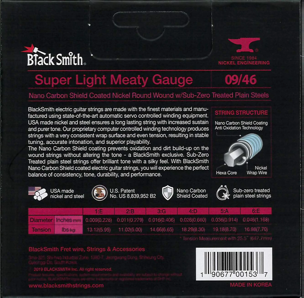 BlackSmith-exkluzív Nano Carbon Shield bevonattal rendelkezik, amely megakadályozza az oxidációt és a szennyeződések felhalmozódását anélkül, hogy a hangzást megváltoztatná. A fagyasztással kezelt acél húrok csilingelő hangzást és lágy tapintást adnak. Ez együttesen biztosítja a konzisztencia, a hangszín, a tartósság és a teljesítmény tökéletes egyensúlyát.