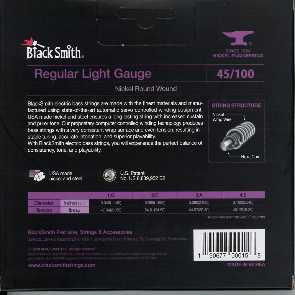 A BlackSmith elektromos basszus húrok a legkiválóbb alapanyagokból készülnek a legmodernebb tekercselő berendezés használatával. Az USA-ban gyártott nikkel és acél hosszú élettartamot és tisztább hangzást kölcsönöz, mint a hagyományos nikkel tekercselésű húr. Számítógépvezérelt technológiával egyenletes tekercselést és húrnyomást kapunk, ami stabil hangolást, pontos intonációt és kiváló játszhatóságot eredményez. Az egyedülálló, szabadalmazott vákuumzárású, csavarodásmentes csomagolásnak köszönhetően a húr nem rozsdásodik és nem sérül.