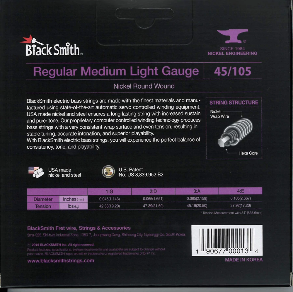 A BlackSmith elektromos basszus húrok a legkiválóbb alapanyagokból készülnek a legmodernebb tekercselő berendezés használatával. Az USA-ban gyártott nikkel és acél hosszú élettartamot és tisztább hangzást kölcsönöz, mint a hagyományos nikkel tekercselésű húr. Számítógépvezérelt technológiával egyenletes tekercselést és húrnyomást kapunk, ami stabil hangolást, pontos intonációt és kiváló játszhatóságot eredményez. Az egyedülálló, szabadalmazott vákuumzárású, csavarodásmentes csomagolásnak köszönhetően a húr nem rozsdásodik és nem sérül.