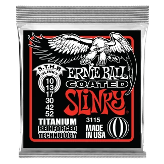 Az Ernie Ball Coated Slinky húrok kombinálják a legmodernebb fejlesztéseket a húriparban. Az összes sodrott húr mind kezelve van egy ultra vékony lakkréteggel ami megakadályozza a húrok oxidációját. Ezáltal ötször tovább tart az "új húr érzet" mint egy hagyományos bevonat nélküli húrnál. A sima (nem sodrott) húrok ötvözik a korrózióvédő bevonatot az RPS technológiával, viszont itt titán erősítéssel. A titánban rejlő erő megakadályozza a húrok szakadását, letekeredését és bizonyítottan tovább tartja a hangolást mint a hagyományos húrok. Az Ernie Ball Coated Slinky húrok teljesen olyan érzetet keltenek, mind játékérzetben mind pedig hangzásban mint a normál, bevonat nélküli húrok, viszont nagy hatásfokkal védik azokat annak érdekében, hogy sokáig tartson az a legendás hang és érzés amit a zenészek már 50 éve szeretnek. Átmérő .010 .013 .017 .030 .042 .052