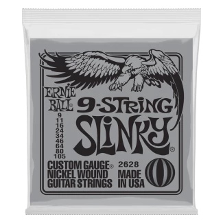 Az Ernie Ball 9 String Slinky húrok széleskörben nagyrabecsült húrok a világszínvonalú hangjuknak köszönhetően. Ezek a húrok a precíz gyártásnak köszönhetően tökéletes összetételűek, optimális játékérzetet biztosítanak és hosszú élettartamúak. A 9 String Slinky sodrott húrjai nickel bevonatú acélhúrok melyek egy hatszögletű acél vezetőszál köré vannak tekerve. A sima húrok vékony bevonatú karbon acélból készülnek, ezzel nyújtva a tökéletesen kiegyensúlyozott hangot a gitárodnak. A húrok átmérője .009 .011 .016 .024 .034 .046 .064 .080 .105