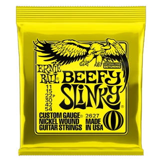 Az Ernie Ball Beefy Slinky húrokat elsősorban azoknak ajánljuk akik szeretik a mély hangolást a gitárjukon. A metálzenészek világszerte azért tették le voksukat a Beefy Slinky mellett mert optimális a húrok átmérője a drop D és drop C hangoláshoz. Ezek a húrok a precíz gyártásnak köszönhetően tökéletes összetételűek, optimális játékérzetet nyújtanak és hosszú az élettartamuk. A Beefy Slinky sodort húrjai nickel bevonatú acélhúrok melyek egy hatszögletű acél vezetőszál köré vannak tekerve. A sima húrok vékony bevonatú karbon acélból készülnek, ezzel nyújtva a tökéletesen kiegyensúlyozott hangot a gitárodnak. A húrok átmérője. 011 .015 .022p .030 .042 .054