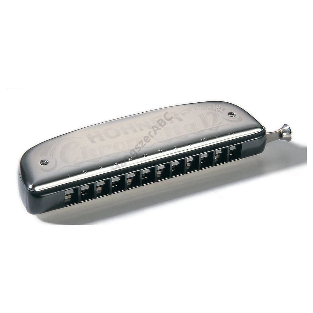 szájharmonika: Chrometta kromatikus szájharmonika, rozsdamentes acél fedőlemez, műanyag test (fésű), 48 darab 1.05 mm réz lamella, 12 hanglyuk, 16.5 cm hosszúság, hangnem: C, robusztus felépítés, kezdőknek is megfelelő