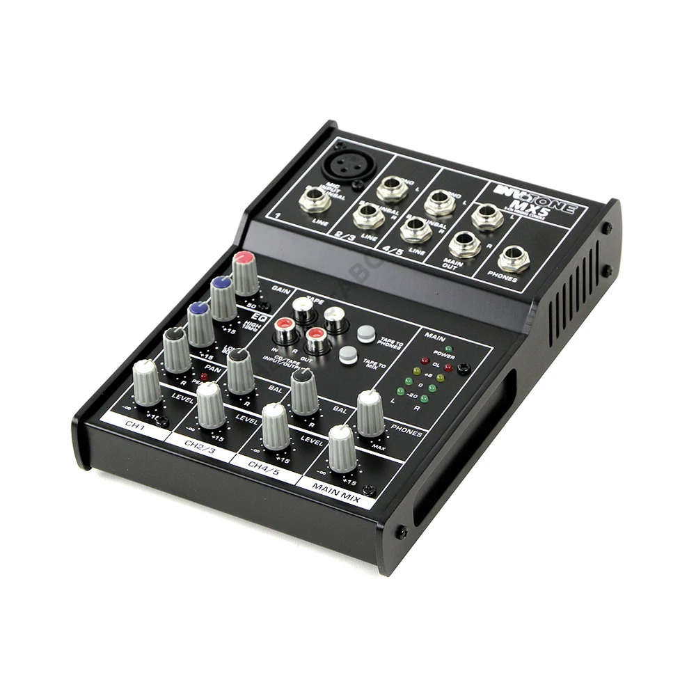 5 csatornás keverőpult. 1 mono csatorna XLR és szimmetrikus jack csatlakozókkal 4 mono, vagy 2 sztereó csatorna szimmetrikus jack csatlakozókkal 2 sávos EQ 2 sávos RCA IN/OUT