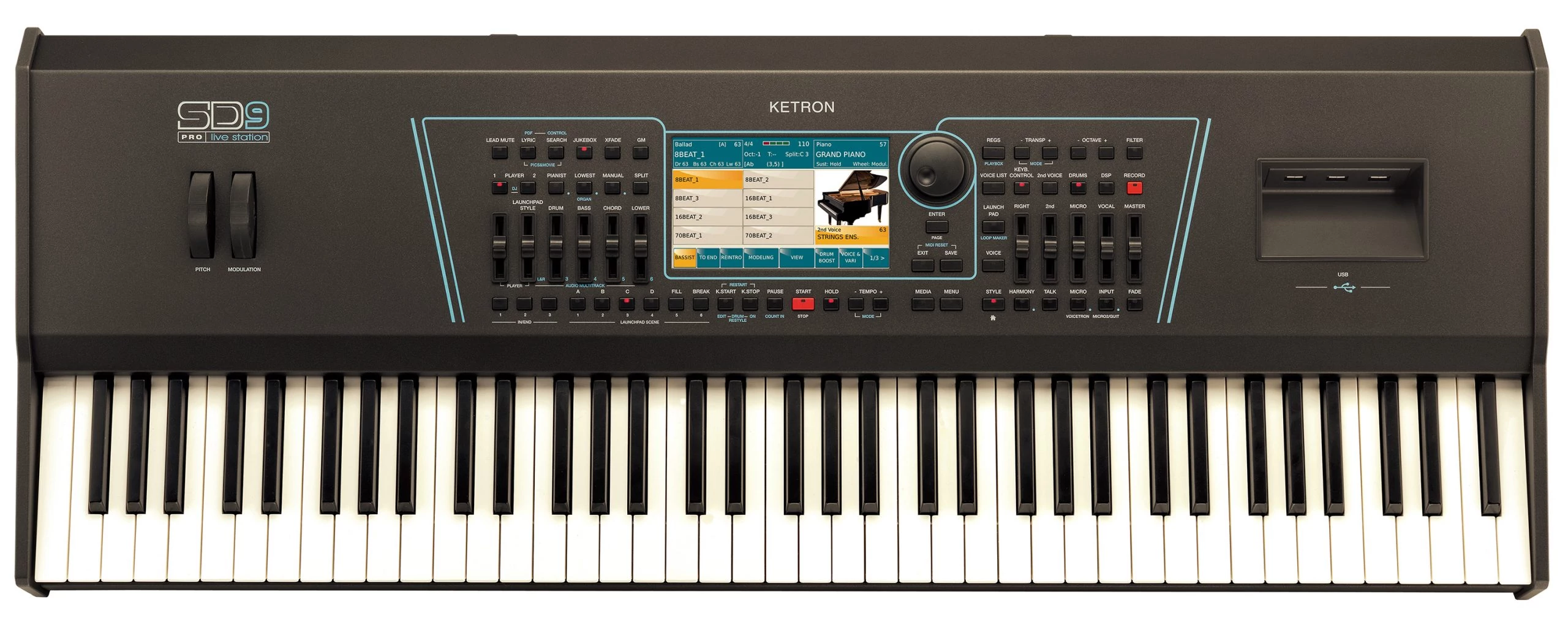 - Billentyűzet: 76 súlyozott billentyű. 4 érzékenységi görbe. Programozható érintésérzékenység. Aftertouch. Portamento. Joystick: Hangmagasság, Moduláció. Transzponáló: +/- 24. Oktáv: +/- 2.