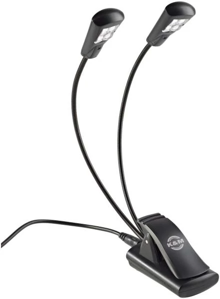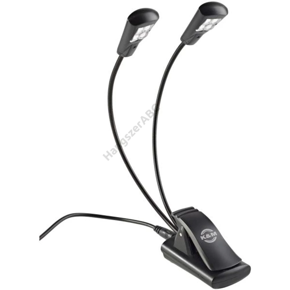 König & Meyer kottalámpa - Double4 LED Flex Light – 2x4 LED-es, csíptethető, 3 db AAA elemmel illetve a tartozék 110-240 V AC adaprel táplálható, flexibilis nyakkal, fekete