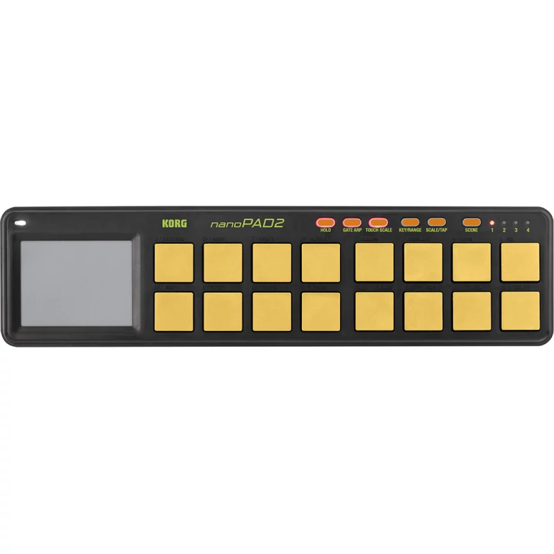 Hordozható, kisméretű USB pad kontroller, limitált kiadású narancssárga-zöld színben. Alacsony kiépítésű pad kontroller – ideális dobleütések feljátszására 16 nyomásérzékeny, megbízható dobpad Több MIDI paraméter is vezérelhető az X-Y felület segítségével Tizenhat dobpad egy kompakt külsőbe rejtve Mint minden naoSERIES2 kontroller, a nanoPAD2-vel szemben is alapvető elvárás volt az, hogy kifogástalanul együtt legyen képes működni egy laptoppal vagy asztali PC-vel. Ráadásként tizenhat dinamikaérzékeny dobpadot és az X-Y felületet is integrálni kellett az eszközbe. Mindezen elvárásoknak eleget tesz a KORG nanoPAD2. Négy bank-ban tárolhatjuk a hozzárendelési adatokat, így összesen 64 setup mentésére nyílik lehetőségünk. A dinamikaérzékeny dobpadok tökéletesen visszaadják a játék apró részleteit A tizenhat nyomásérzékeny dobpad kiválóan reagál ujjaink érintésére, és realisztikusan továbbítja a leütéseket DAW szoftverünk felé, így élethű dobszólamokat rögzíthetünk. A négy ’scene’ váltogatásával összesen 64 különböző dob-hozzárendelést használhatunk. Hozzon létre szólamokat az X-Y touchpad, a Touch Scale, valamint a Gate Arp funkciók segítségével! Az X-Y pad segítségével több szintetizátor paraméter is vezérelhető. Az új Touch Scale funkció lehetővé teszi az X-Y felületen szólamok intuitív lejátszását, csak úgy, mint a jól ismert Kaossilator modell esetében. Tizenhat különböző skála közül választhatunk, meghatározhatjuk a root key-t (alaphangot), és a hangmagasság terjedelmet, így biztosítva azt, hogy az aktuális dalhoz igazodjanak a játszott szólamok. A Kaossilator Pro-ból kölcsönzött Gate Arp funkció tempó alapú leütés adatokat továbbít – a Tap Tempo és a Tempo Sync funkciók is támogatottak. A Touch Scale-lel kombinálva a Gate Arp funkció alkalmas arra, hogy tempóra szinkronizált ritmusokat játsszunk le az X-Y felület érintésével vagy a padokkal való játékkal. KORG Kontrol Editor szoftver A nanoPAD2 a KORG Kontrol Editor szoftverrel editálható, mely ingyenesen letölthető a KORG weboldaláról. Csak töltsük be számítógépünkön, és máris részletbemenően vagyunk képesek szabályozni számos beállítást. A Velocity beállítások között három különböző görbéjű változatot, és fixált leütésérzékenységet is beállíthatunk, valamint beállíthatjuk a Modulation és Sustain gombok által küldött control change üzenetet is. Hatékony használat az USB segítségével Egy USB-kábellel a nanoPAD2-t számítógépünkbe csatlakoztatva máris készen áll a hordozható zenei produkciós rendszer. A tápellátás és a MIDI adatok egyazon kábelen keresztül futnak, így a munkakörnyezet is letisztultabbá válik.