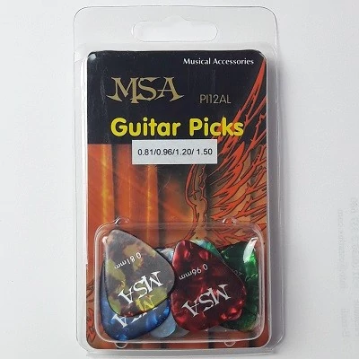 MSA AP-12AL 12 db-os, nylon alapanyagú pengető készlet 0.81/ 0.96/ 1.2/ 1.5 vastagságban, több színben, nyitható-zárható praktikus csomagolásban. Ajándéknak is kiváló! A pengetők tartósak, nehezen kopnak, rugalmasak.