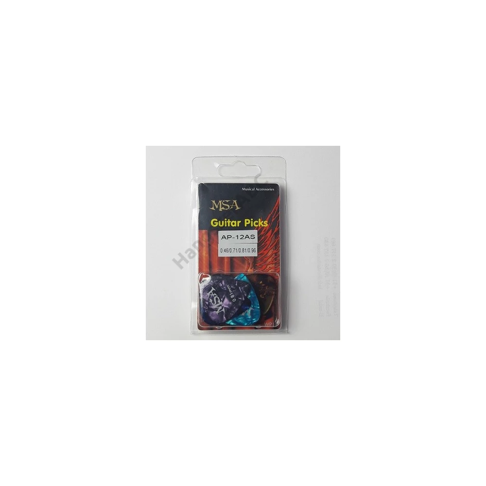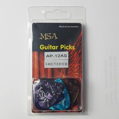 MSA AP-12AS 12 db-os, nylon alapanyagú pengető készlet 0.46/ 0.71/ 0.81/ 0.96 vastagságban, több színben, nyitható-zárható praktikus csomagolásban. Ajándéknak is kiváló! A pengetők tartósak, nehezen kopnak, rugalmasak.