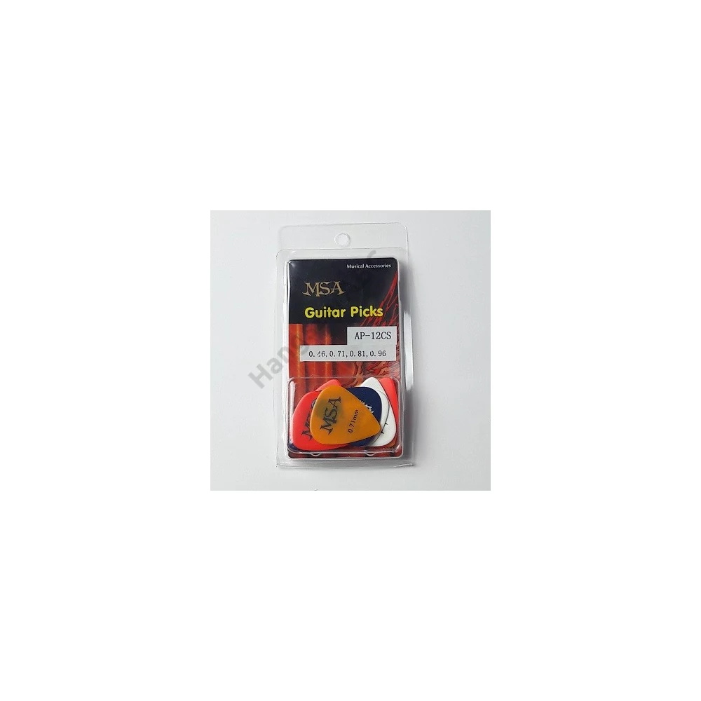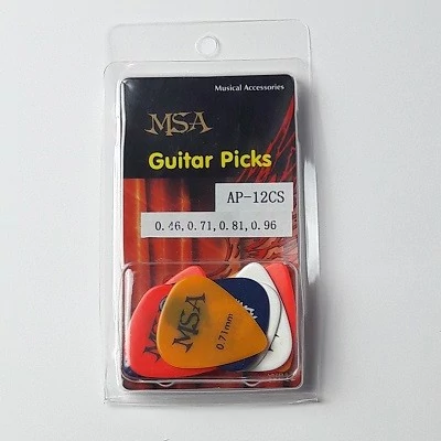 MSA AP-12CS 12 db-os, nylon alapanyagú pengető készlet 0.46/ 0.71/ 0.81/ 0.96/ vastagságban, több színben, nyitható-zárható praktikus csomagolásban. Ajándéknak is kiváló! A pengetők tartósak, nehezen kopnak, rugalmasak.