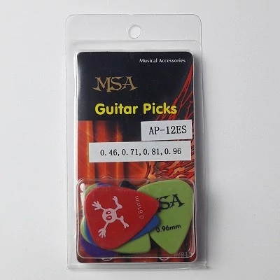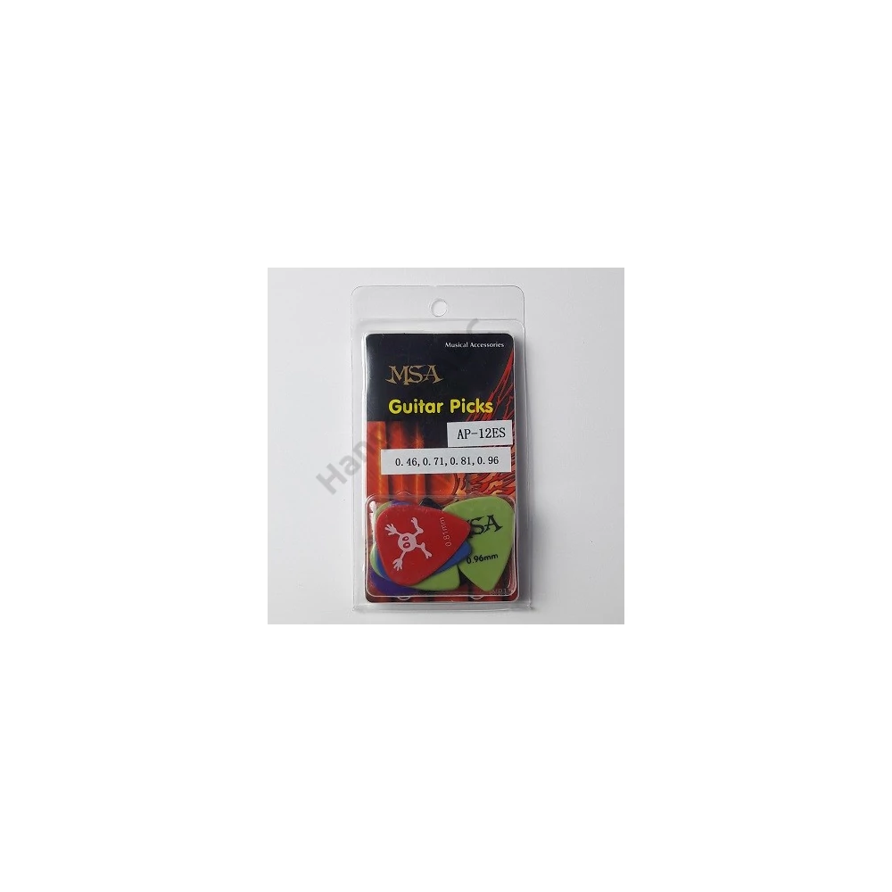 MSA AP-12ES 12 db-os, nylon alapanyagú pengető készlet 0.46/ 0.71/ 0.81/ 0.96/ vastagságban, több színben, nyitható-zárható praktikus csomagolásban. Ajándéknak is kiváló! A pengetők tartósak, nehezen kopnak, rugalmasak.