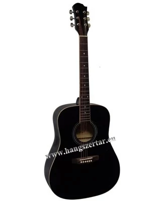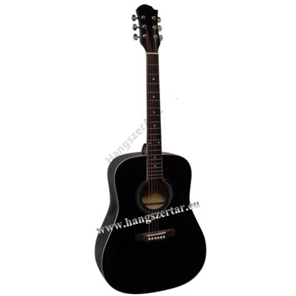 MSA fekete westerngitár -márkája MSA - kezdőknek és haladóknak is kiváló fémhúros gitár - fém csavarokkal - mérete 4/4 - hossza kb. 103 cm - gitártest hossza kb. 50 cm, szélessége kb. 40 cm, magassága kb. 11 cm - szélessége az 1. bundnál kb. 4,5 cm - 20 bund - heveder rögzítési lehetőség - fém húrokkal