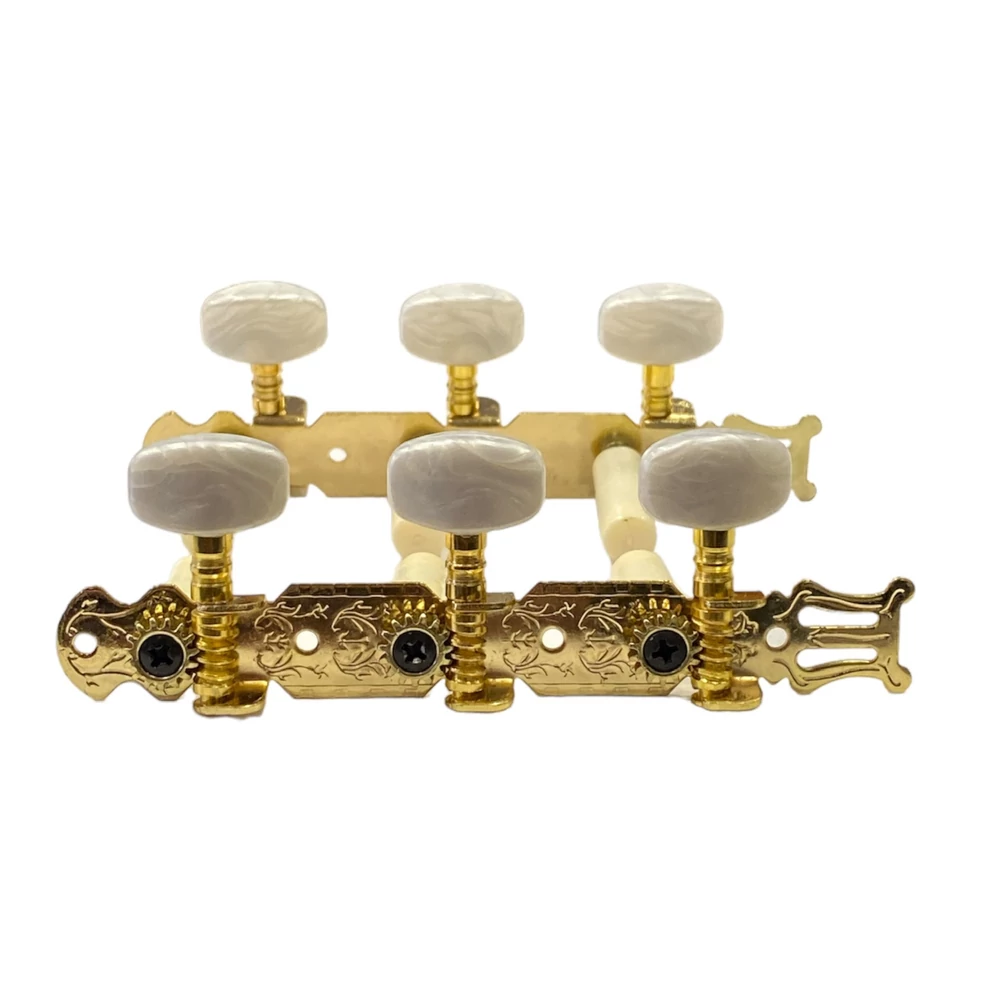 Az MSA MEC-2 arany-gyöngyház klasszikus hangolókulcs készlet a tökéletes választás minden klasszikus gitáros számára, aki igényes és elegáns megjelenést keres a hangszere számára. Az arany színű és gyöngyház hatású kulcsok stílusos megjelenést kölcsönöznek a gitárodnak, és megbízható hangolást biztosítanak minden játék alkalmával.