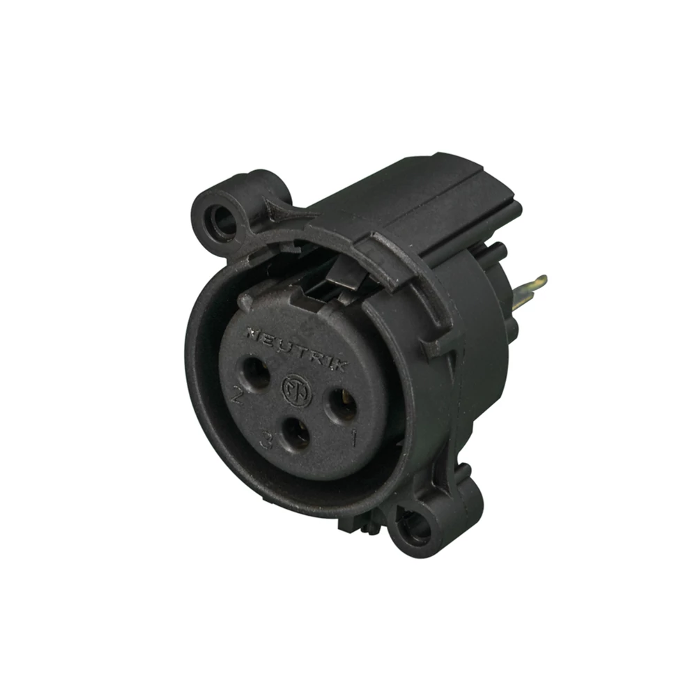 3 pólusú, anya XLR dugaszalj, földelés: föld / burkolati érintkező nélkül, vertikális PCB foglalat, Rögzítőrugó (zár helyett).