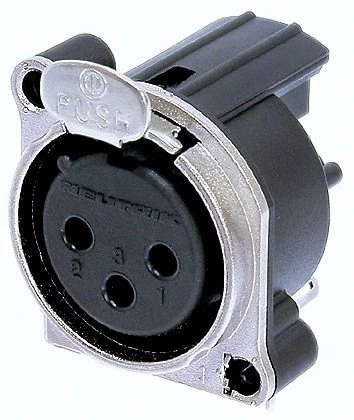 3 pólusú, anya XLR dugaszalj, földelés: közvetlen panel és burkolat csatlakozás, horizontális PCB foglalat.