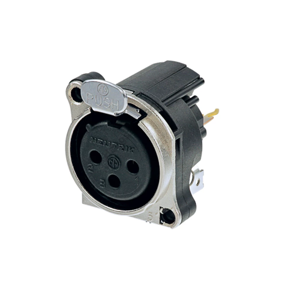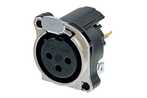 3 pólusú, anya XLR dugaszalj, földelés: pin1-re párosítható csatlakozóház és előlapi panel, vertikális PCB foglalat.