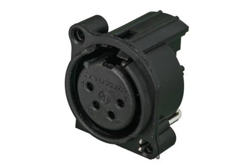 4 pólusú XLR mama csatlakozó aljzat. Külön földelő kontaktus a papa csatlakozó háza és az előlap között.