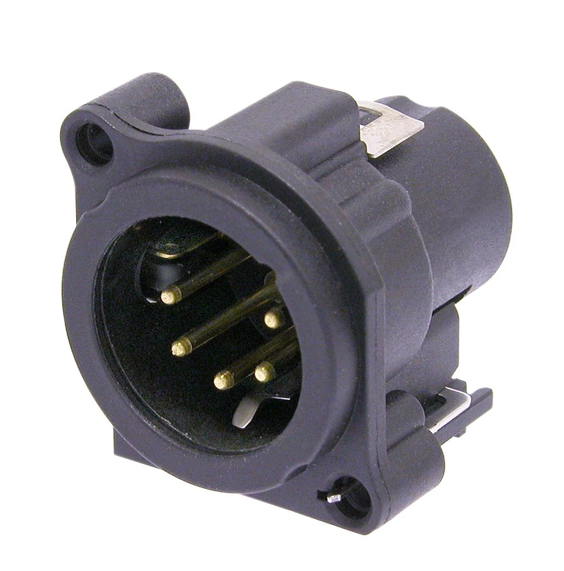 5 pólusú apa XLR dugaszalj, földelés: külön föld kontakt a burkolat és az elülső panel között, vertikális PCB foglalat, fekete króm burkolat.