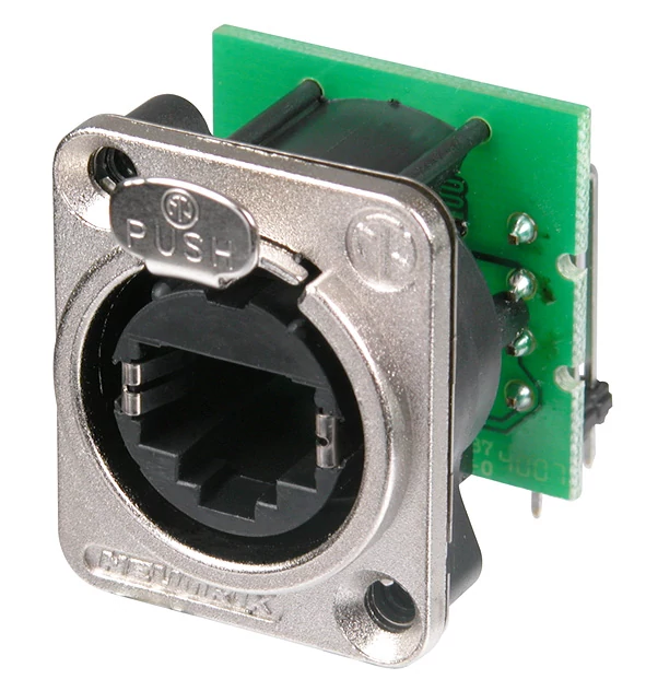 Horizontális C5e komponens kompatibilis PCB panelrögzítős RJ45 csatlakozó, D-alakú fémkarima, rögzítőzárral, maximális panelvastagság 4 mm.