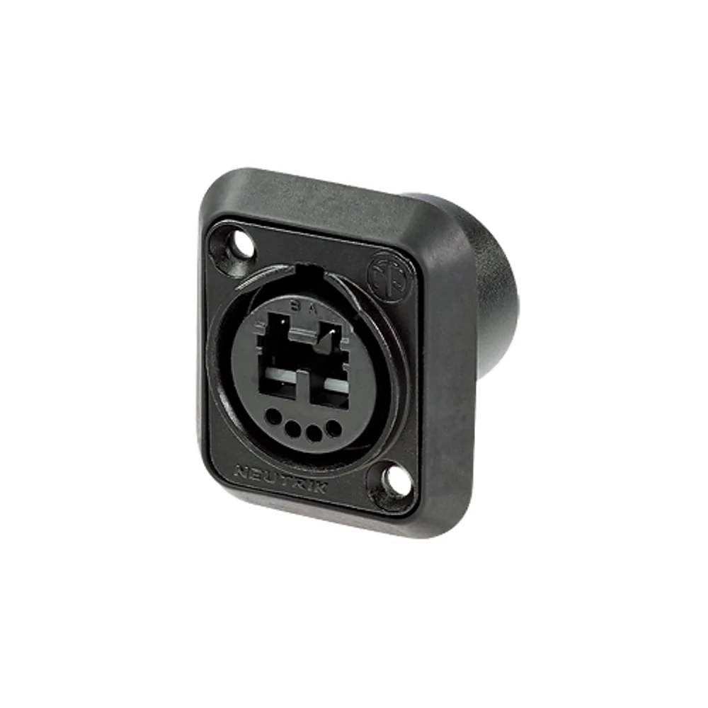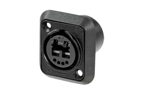 Vázcsatlakozó fekete, króm burkolattal, 4 forrasztható érintkező, 1 LC-Duplex áramátvezető foglalat és 1 ház-föld érintkezővel (SMPTE kábelvédelemhez), IP 65 szerinti vízállóság, elülső panelrögzítés.