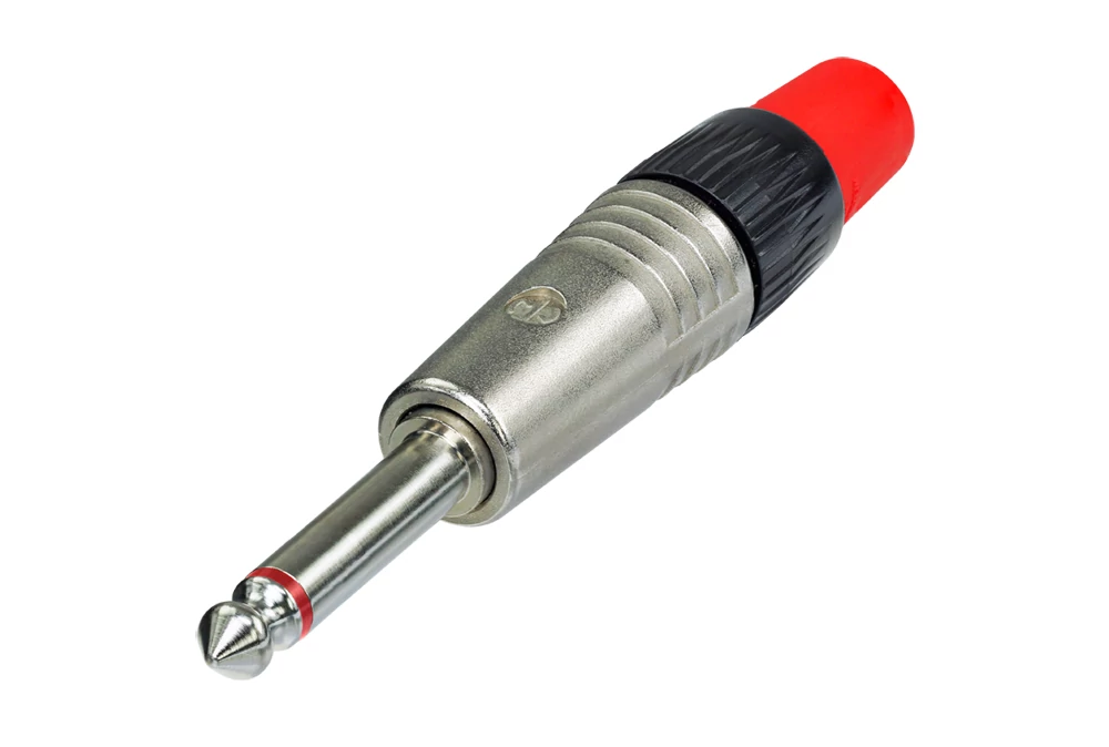 2 pólusú 6.3mm professzionális phone dugasz, beépített 1:10 transzformátor, ami a szimmetrikus jeleket (TRS, mic) asszimetrikusá konvertálja (TS, gitár), nikkel ház, piros szigetelő hüvely.