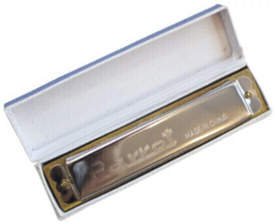 szájharmonika: 20 hanglyukú, kétsoros, krómozott, hangnem: C