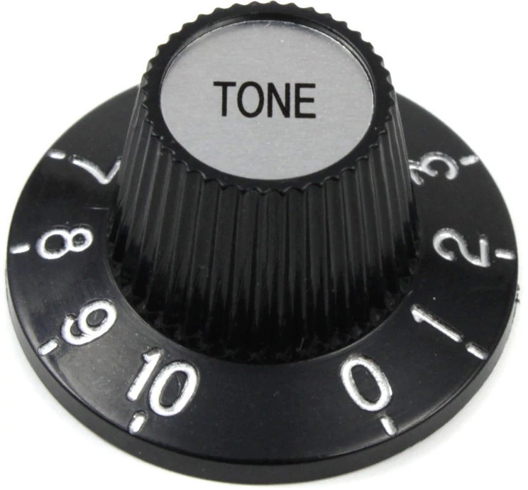 pótalkatrész: kalap alakú potméter sapka TONE potira, fekete / króm kivitel, 1-10 - metrikus menet - 18 horony