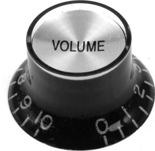 pótalkatrész: műanyag potméter sapka hangerőszabályzóra, harang alakú króm tetővel, értékek: 1-10, fekete szín, US standard menet - 24 horony
