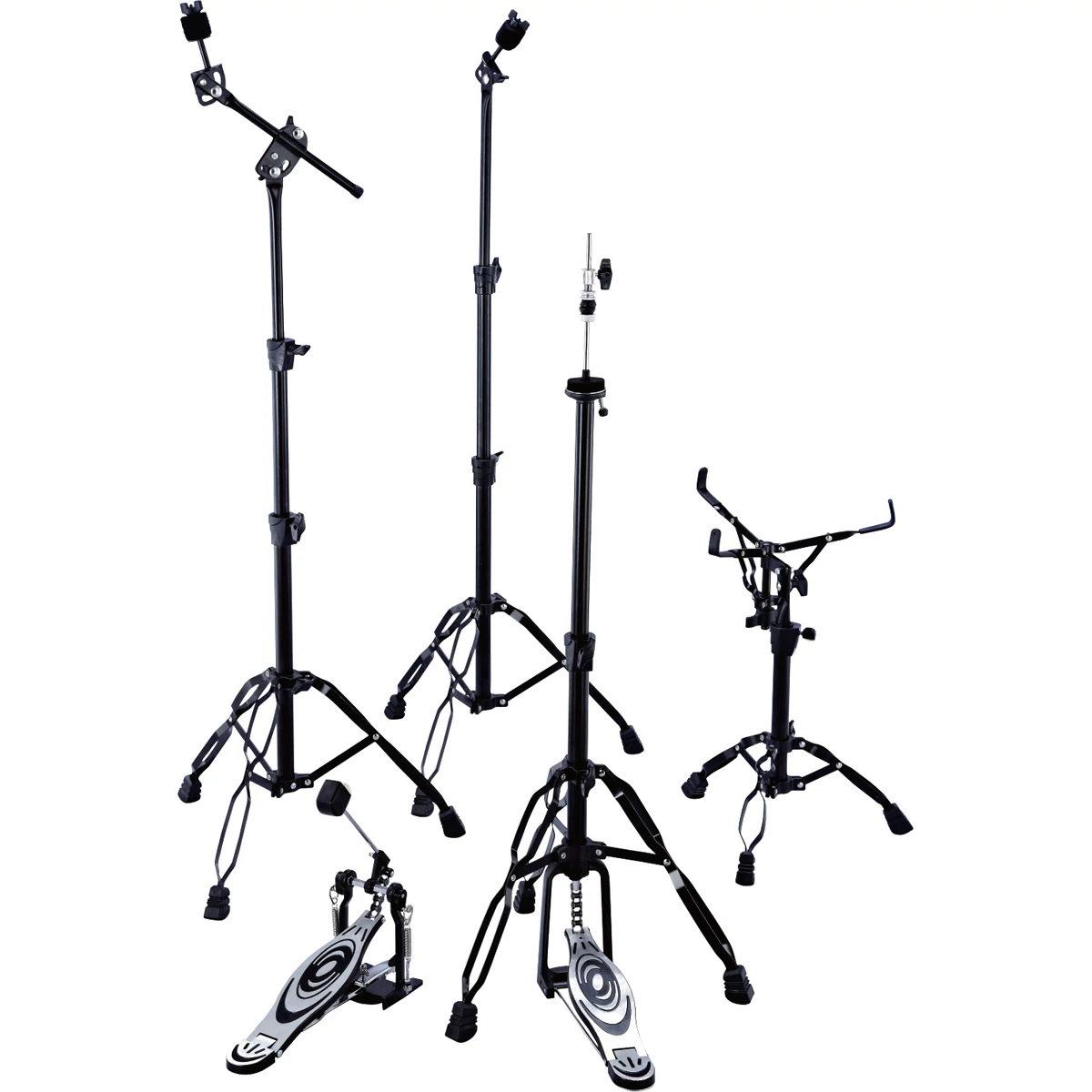 - Kit includes: hihat stand (HS-202), snare stand (SS-202), straight cymbal stand (CS-202), boom cymbal stand (BS-202), kick drum pedal (P-410)