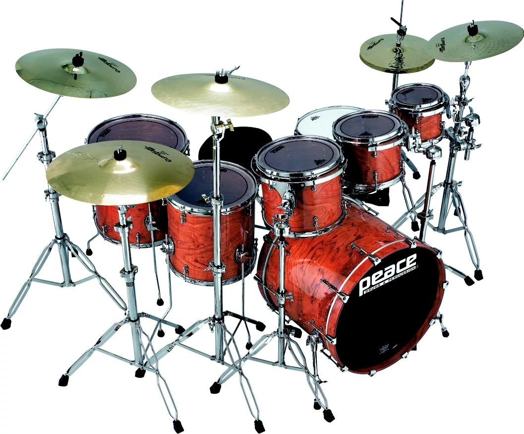 • Known for its rich appearance and figuring, high density, and rock-like hardness, bubinga, also known as African rosewood, is also highly regarded for its acoustic properties. As a tone wood, bubinga has a wide frequency response, covering the audio spectrum from deep, clear lows to lots of bright top end. That’s why bubinga is used in pianos and guitars. Its extreme hardness, however, makes it difficult to form into drum shells. Most manufacturers shy away from such a formidable challenge, and typically companies that offer a bubinga option don’t like it known that their bubinga is only a veneer. The Peace Kahuna is all bubinga – 9 plies of hand selected bubinga for tone, volume, and sheer strength: Its beauty isn’t just skin deep. The high priest in the island kingdom of Hawaii was titled Kahuna, and the term was later appropriated by local surfers to identify the leader or master surfer of a group or club. Likewise, Peace’s Kahuna kit is top echelon – drums for the master blaster. Play a Kahuna and you’ll know what we mean.